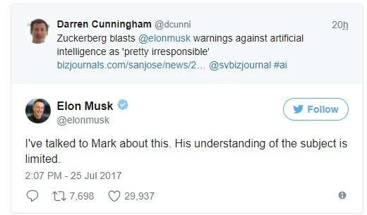 หลังจากที่ Elon Musk ออกตัวแรงว่า A.I. ควรจะมีการกำกับดูแลเพราะอาจเป็นภัยคุกคามต่อมวลมนุษยชาติได้ Mark Zuckerberg ออกมาโต้กลับแล้วแม้จะไม่ได้ระบุชื่อ Elon ชัดเจน แต่ก็เห็นว่าความคิดดังกล่าวของ Elon นั้นดูไร้ความรับผิดชอบพอสมควร และเป็นความคิดในแง่ลบเกินไป และยังเสริมทับอีกว่าเทคโนโลยีนั้นสามารถนำมาใช้ได้ทั้งในด้านดีและด้านร้าย คนที่สร้างมันขึ้นมาก็ต้องระมัดระวังด้วย