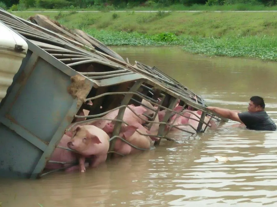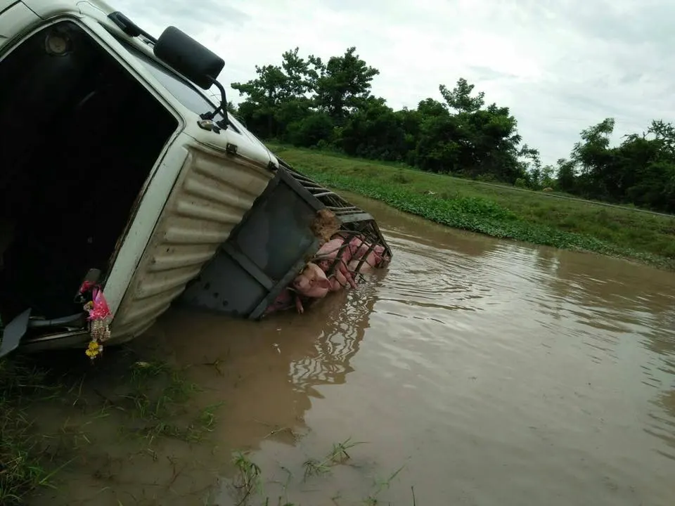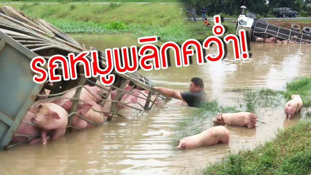 ด่วน! รถหมูพลิกคว่ำลงคูน้ำ จ.สุพรรณบุรี