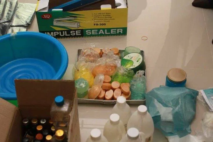 อึ้ง!ตร.บุกจับ ผัวเมียลักลอบผลิตอาหารเสริมเถื่อน พบกำลังกวนฯ กับมือในหม้อปรุงอาหาร หลอกคนมาร่วมลงทุน