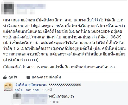 และตอนท้ายคลิปบอกว่า จะไม่ทำต่อ 98-99 เปอร์เซ็นต์ เป็นไปได้ว่า 1-2 เปอร์เซ็นต์ ยังจะทำต่อและจะทำคลิปในรูปแบบต่าง ๆ โดยมีที่ปรึกษา แถมงานนี้ดูเหมือนว่าอาจจะทำคลิปเผยแพร่ช่องทางอื่นในอนาคตอีกด้วย