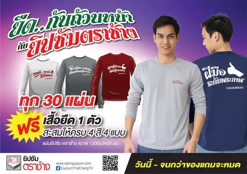 “ยิปซัม ตราช้าง” จัดโปรโมชั่นพิเศษ “ยืด..กันถ้วนหน้า กับ ยิปซัม ตราช้าง” แจกเสื้อยืดสุดเท่ รับทันที เมื่อซื้อแผ่นยิปซัม ตราช้าง ขนาด 1200x2400 มม. ทุกชนิด โดยทุกๆ 30 แผ่น จะได้รับเสื้อยืดทันที 1 ตัว ซึ่งมีให้เลือกสะสม 4 สี 4 แบบ สุดเท่ สกรีนข้อความโดนใจ ได้แก่ ฝีมือระดับพระกาฬ, งานดี..งานไว ไว้ใจผม, เหนื่อยแต่ไม่ท้อ เพื่อคนที่รออยู่ข้างหลัง และ ลูกผู้ชายพันธุ์แกร่ง สะสมให้ครบ 4 แบบ เพื่อใส่ยืดกันถ้วนหน้า เริ่มตั้งแต่ วันนี้ - จนกว่าของแถมจะหมด ณ ร้านยิปซัมเอ็กซ์เพรส ผู้แทนจำหน่ายเอสซีจี และร้านขายวัสดุก่อสร้างระดับชั้นนำทั่วประเทศ