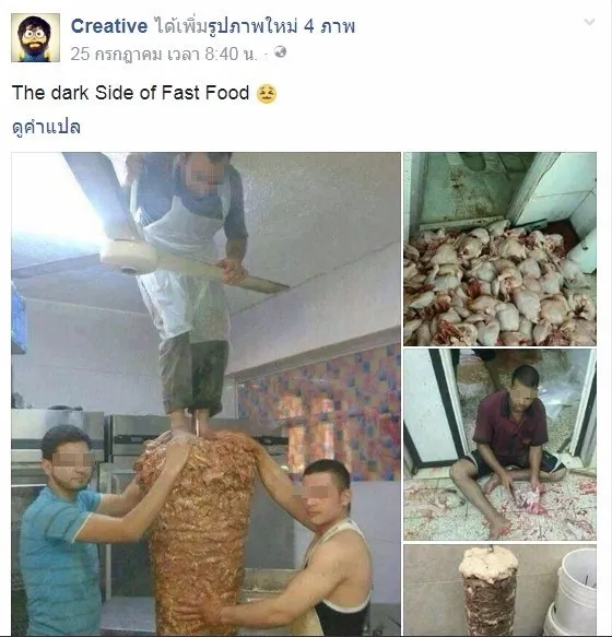 ชาวเน็ตเสนอเรื่องราวของอาหารฟาสต์ฟู้ดแสนอร่อยอย่าง เคบับ ที่เป็นแป้งสีขาวๆไส้ข้างในมีเนื้อไก่ เนื้อวัว แล้วก็ผัก ราดด้วยโยเกิร์ตซึ่งเป็นซอสที่เหลวและก็อร่อย ในความน่ากินแห่งนี้ ท่านทราบหรือไม่วันมันไม่ได้สวยงามและสะอาดอย่างที่คิด โดยล่าสุดมีเพจ Creative ออกมาแชร์ภาพขั้นตอนการทำเคบับ ที่ไม่สะอาดใช้เท้าเหยียบ หั่นกับพื้นห้องน้ำ เห็นแล้วอ้วกแทบพุ่ง ตามมาดูกันดีกว่าว่าจะเป็นอย่างไรกันบ้าง