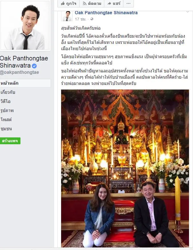 เมื่อวานนี้ 26/7/2560 ทางเฟซบุ้ค คุณ โอ้ค พานทองแท้ ได้โพสต์เฟสบุ้ค อวยพรวันเกิด พ่อ ตามข้อความข้างล่าง