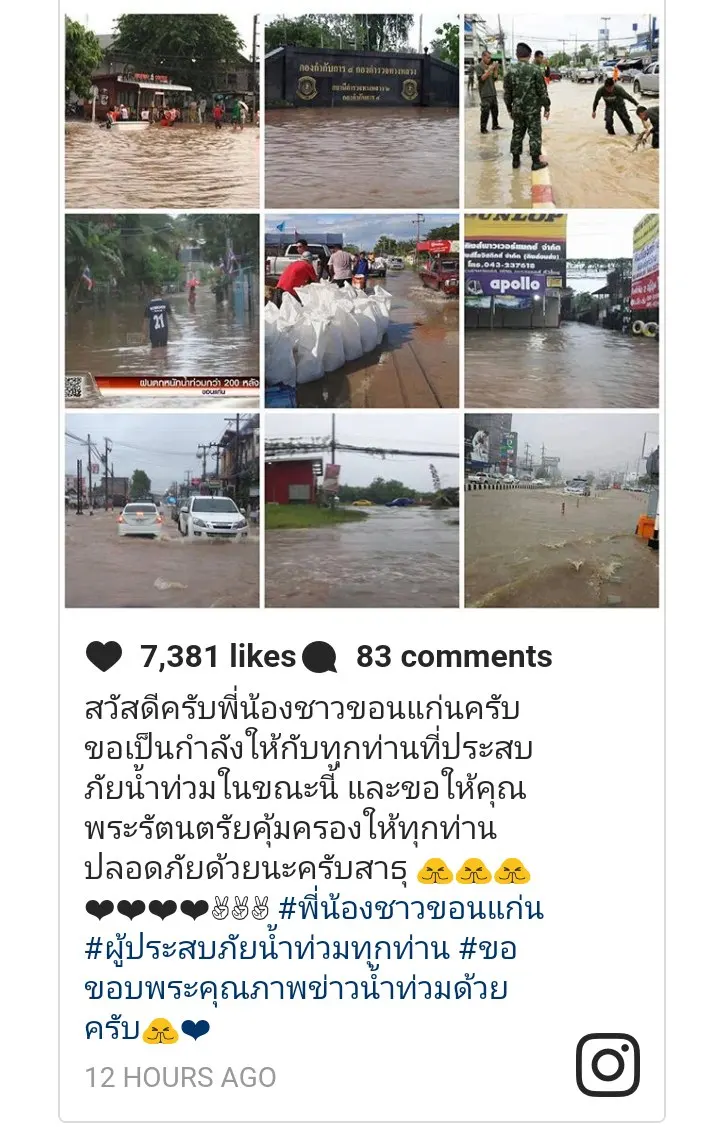 (27 ก.ค.60) ทำเอาหลายคนอดเป็นห่วงไม่ได้หลังจากที่นางสุดารัตน์ คูกิมิยะ หรือ "แม่แก้ว" มารดาของพระเอกดัง "ณเดชน์ คูกิมิยะ" ได้มีการโพสต์ภาพบ้านที่ขอนแก่นที่ถูกน้ำฝนไหลท่วมออกมา อย่างไรก็ตามล่าสุดเจ้าตัวก็ต้องใจชื้นขึ้นมาบ้างหลังจากทางนายอำเภอเมืองขอนแก่นได้เข้าไปให้ความช่วยเหลือแล้ว