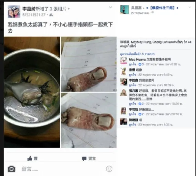 เว็บไซค์ข่าวจากต่างประเทศ มีสาวสวยชื่อ ลีเจียชี สาวไต้หวัน สุดช็อกหลังได้รับภาพสุดสยอง ที่มีลักษณะนิ้วมือคนอยู่ในชามซุป จาก อู จินเจีย ลูกพี่ลูกน้องของเธอ พร้อมคำแคปชั่น ชวนขนหัวลุกที่ว่า นี่คือนิ้วมือของแม่เธอ เมื่อวันที่ 21 พ.ค.ที่ผ่านมา