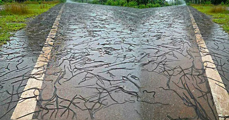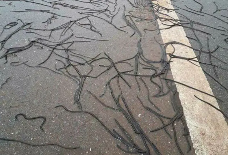 ขนลุก ไส้เดือนหนีน้ำท่วมเต็มถนนที่ อ อากาศอำนวย สกลฯ ชาวบ้านเชื่อสัญญาณอันตราย
