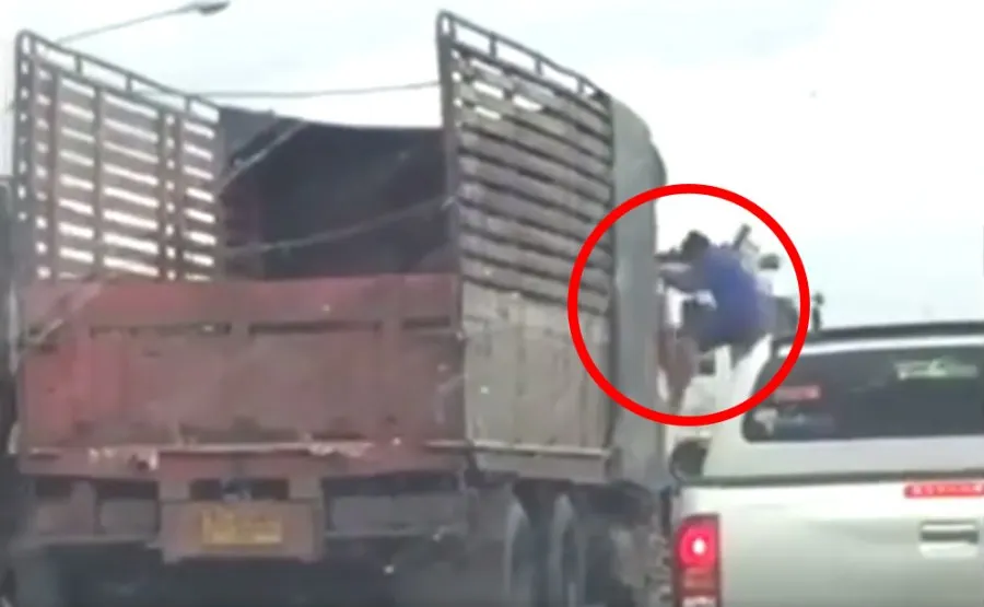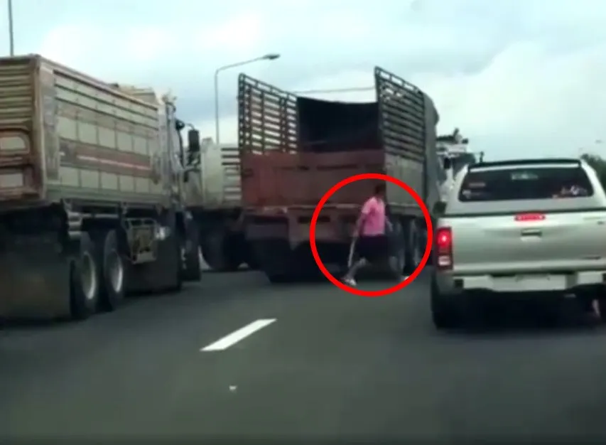 เกิดเหตุระทึกขึ้นกลางถนน ที่รถกำลังติดไฟแดงอยู่ เมื่อบรรดารถสิบล้อ - รถพ่วง เปิดศึกกัน มีทั้งถีบเข้าไปในรถ และถืออะไรบางอย่างคล้านไม้หรือมีดด้วย