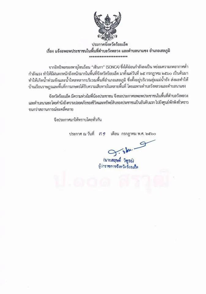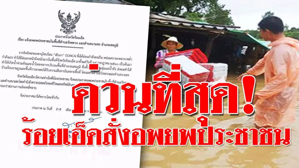 ด่วนที่สุด!! จังหวัดร้อยเอ็ด ประกาศอพยพประชาชน ในพื้นที่ต.วังหลวง และต.นาแซง อ.เสลภูมิ ไปยังศูนย์พักพิงชั่วคราวโดยเร็ว