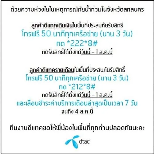 “ดีแทค” ก็ไม่น้อยหน้า ขออาสาให้โทรฟรี 50 นาที ลูกค้าที่ประสบภัยน้ำท่วมใน จ.สกลนคร โดยลูกค้าดีแทคเติมเงินรับสิทธิ์โทรฟรี 50 นาทีทุกเครือข่ายนาน 3 วัน ลูกค้าสามารถกด *222*8# เพื่อรับสิทธิ์ได้ตั้งแต่ 30 ก.ค.-1 ส.ค.นี้ และเตรียมเครื่องปั่นไฟฟ้าแบบพกพา (Mobile Generator) เข้าในพื้นที่อย่างเร่งด่วน นอกจากนั้น ดีแทคได้เตรียมน้ำมันสำรองไว้ตามแผนงานในพื้นที่ฉุกเฉิน สำหรับในกรณีถ้ามีการตัดกระแสไฟฟ้าจากการไฟฟ้าส่วนภูมิภาค โดยสถานีฐานของดีแทคจะสามารถดำเนินการได้อย่างต่อเนื่องหลังจากที่มีการตัดกระแสไฟฟ้า พร้อมยังได้จัดเตรียมทีมงานดูแลสัญญาณจังหวัดที่มีฝนตกหนักและน้ำท่วมฉุกเฉินตลอด 24 ชั่วโมง