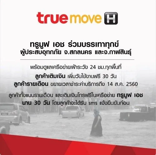 ทรูมูฟเอชขอส่ง4Gให้โทรฟรีในเครือข่าย30วัน แก่ลูกค้าใน จ.สกลนครที่ได้รับความเสียหายเต็มพื้นที่และพื้นที่ประกาศภัยพิบัติที่ จ.กาฬสินธุ์ในเบื้องต้น แต่หากมีพื้นที่ใดเสียหายเพิ่มเติม จะพิจารณาสิทธิการช่วยเหลือครั้งนี้ให้ทราบอีกครั้ง