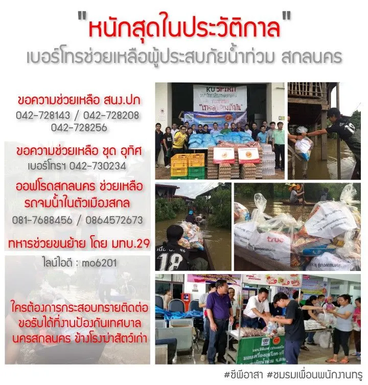 จากเหตุอุทกภัยน้ำท่วมที่เกิดขึ้นที่ จ.กาฬสินธุ์ และจ.สกลนคร ทำให้พี่น้องประชาชนอาจไม่สะดวกการใช้สัญญาณโทรศัพท์ และไม่สะดวกชำระค่าบริการ ในพื้นที่จังหวัดประสบอุทกภัย ทั้งระบบเติมเงินและรายเดือน 3 ค่ายมือถือดังจึงขอเป็นจิตอาสาลงพื้นที่ดูแลเสาส่งสัญญาณในทุกเครือข่ายให้สามารถใช้งานมือถือได้ตามปกติ พร้อมทั้งยืดระยะเวลาการชำระค่าบริการออกไป และไม่ให้มีการตัดสัญญาณ จนกว่าสถานการณ์น้ำท่วมจะดีขึ้น เพราะการติดต่อสื่อสารเป็นสิ่งที่จำเป็นในการประสานงานและขอความช่วยเหลือ พร้อมทั้งมอบสิ่งของที่จำเป็นให้กับผู้ประสบภัยน้ำท่วมในครั้งนี้ด้วย