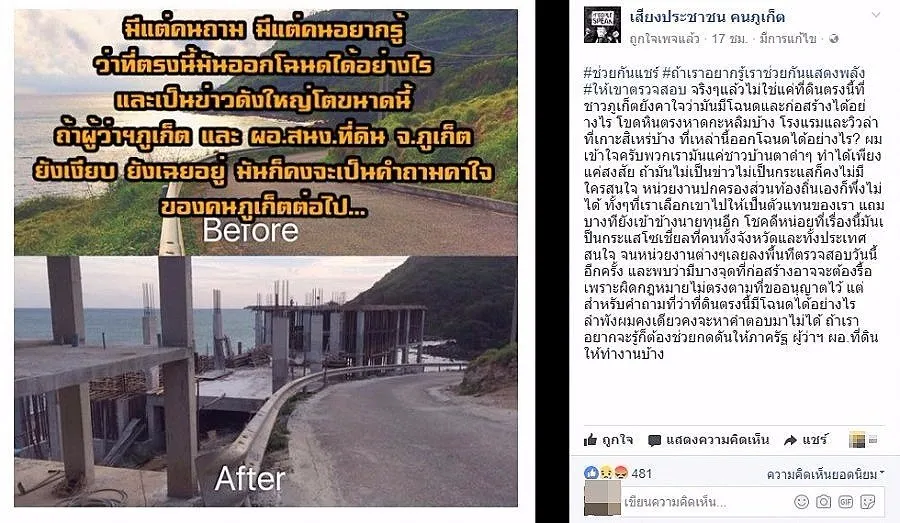 โดยเฟซบุ๊ก เสียงประชาชน คนภูเก็ต โพสท์ระบุว่า #เป็นไงครับสวยมากมั้ย นี่คือรูปโมเดลของตึกอาคาร 4 หลัง ที่กำลังเป็นกระแสข่าวอยู่ตอนนี้ พิกัดทางไปอ่าวแสนและแหลมกระทิง หากก่อสร้างเสร็จจะเป็นแบบนี้ครับ แต่ตอนนี้หลังจากที่ทต.ราไวย์และสนง.ทรัพยากรธรรมชาติและสิ่งแวดล้อมลงไปตรวจ ได้มีการสั่งระงับก่อสร้างอยู่ครับ