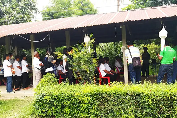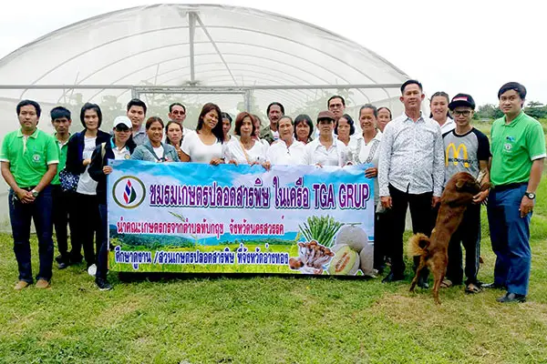 นายจตุโชค จันทรภูมิ (ขวาสุด) ผู้จัดการประจำภาค พร้อมทีมงานชมรมเกษตรปลอดสารพิษ ในเครือ ทีจีเอ กรุ๊ป ผู้นำด้านเกษตรปลอดสารพิษครบวงจ