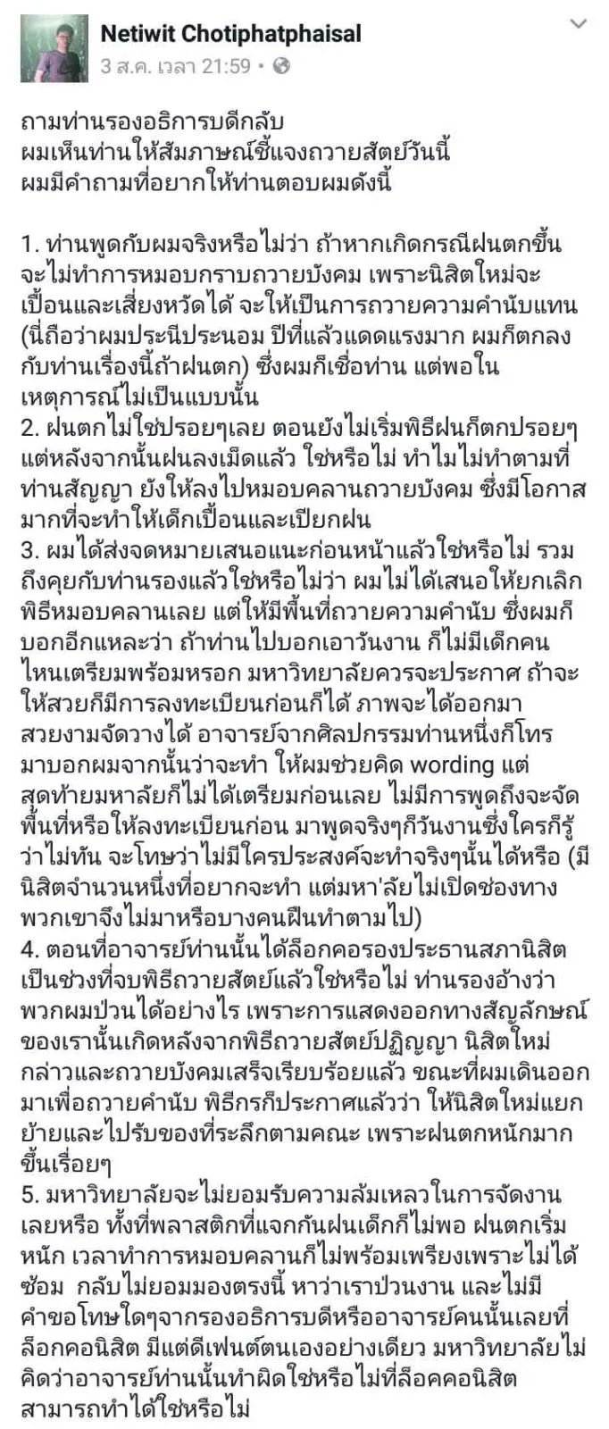 5. มหาวิทยาลัยจะไม่ยอมรับความล้มเหลวในการจัดงานเลยหรือ ทั้งที่พลาสติกที่แจกกันฝนเด็กก็ไม่พอ ฝนตกเริ่มหนัก เวลาทำการหมอบคลานก็ไม่พร้อมเพรียงเพราะไม่ได้ซ้อม กลับไม่ยอมมองตรงนี้ หาว่าเราป่วนงาน และไม่มีคำขอโทษใดๆจากรองอธิการบดีหรืออาจารย์คนนั้นเลยที่ล็อกคอนิสิต มีแต่ดีเฟนต์ตนเองอย่างเดียว มหาวิทยาลัยไม่คิดว่าอาจารย์ท่านนั้นทำผิดใช่หรือไม่ที่ล็อคคอนิสิต สามารถทำได้ใช่หรือไม่