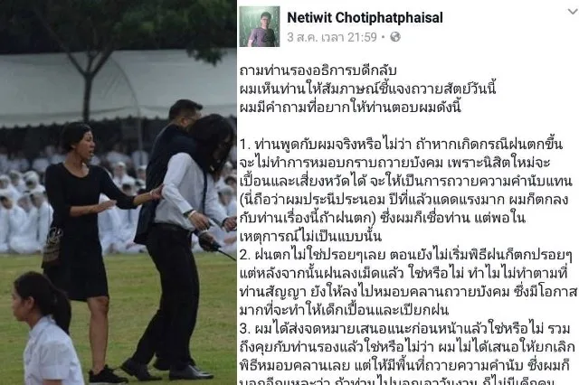 2. ฝนตกไม่ใช่ปรอยๆเลย ตอนยังไม่เริ่มพิธีฝนก็ตกปรอยๆ แต่หลังจากนั้นฝนลงเม็ดแล้ว ใช่หรือไม่ ทำไมไม่ทำตามที่ท่านสัญญา ยังให้ลงไปหมอบคลานถวายบังคม ซึ่งมีโอกาสมากที่จะทำให้เด็กเปื้อนและเปียกฝน