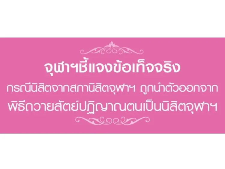 ตามที่มีภาพและข่าวเผยแพร่ทางสื่อต่างๆ ถึงพิธีถวายสัตย์ปฏิญาณตนเป็นนิสิตจุฬาฯซึ่งจัดขึ้นในเย็นวันนี้ และกรณีที่รองประธานสภานิสิตจุฬาฯ ถูกอาจารย์นำตัวออกจากพิธีนั้น