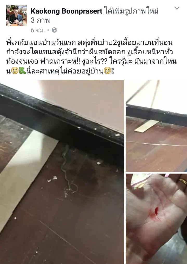 เป็นงูอะไรก็ไม่ทราบ แต่ดูเหมือนงูเขียว ยาวเกือบเมตร เรื่องเกิดมาวานนี้ พอดีเหนื่อยเผลอหลับ มีอะไรไม่รู้เหมือนกำลังเลื้อยช้าๆ ผ่านมือไปสบายใจเลย รออะไรล่ะ เราเลยสะดุ้งตื่น พร้อมกับสะบัดมืออย่างไว พอเห็นแล้วขนลุกซู่ ตกใจสุดขีด คิดว่าจะเอาไงดี จับเป็นหรือจับตาย