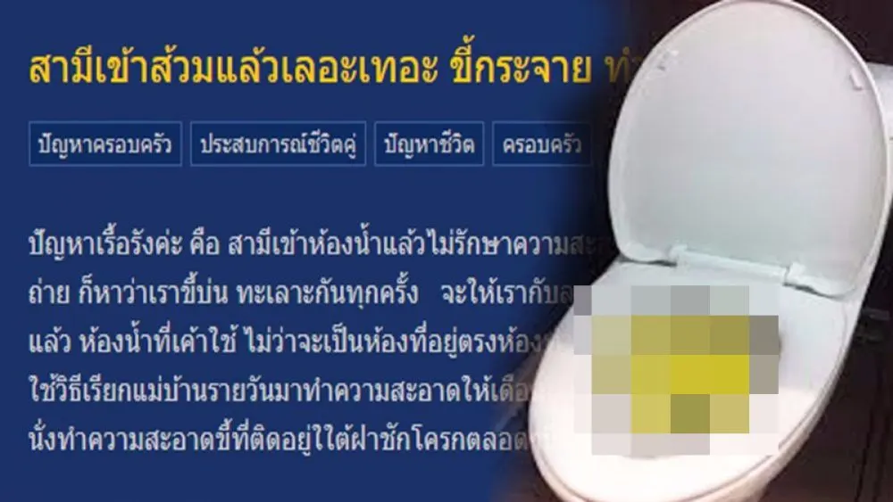 สมาชิกเวบไซต์พันทิปมีเรื่องหนักอกหนักใจ คือสามีขี้กระจายเลอะส้วม แล้วไม่ยอมรักษาความสะอาดหลังขี้ จะให้มานั่งตามเช็ดขอบส้วมทุกครั้งก็ไม่ไหว จึงโพสท์ขอคำแนะนำโดยโพสท์เล่าว่า...