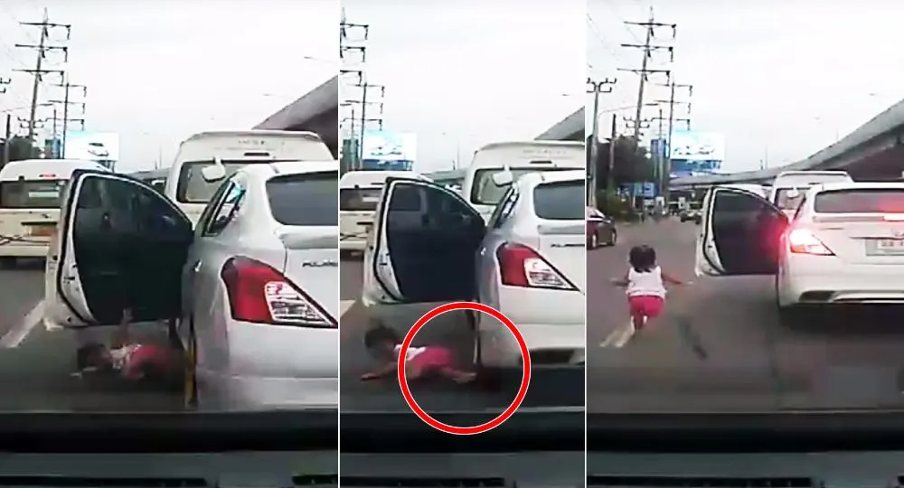 หวิดเหยีบขาลูก!! เด็กร่วงจากรถบนถนน เพิ่งรู้ตัวเมื่อรถเคลื่อนออกไปแล้ว