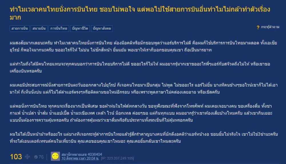 เมื่อ สมาชิกหมายเลข 4036404 ตั้งกระทู้หัวข้อ ทำไมเวลาคนไทยนั่งการบินไทย ชอบไม่พอใจ แต่พอไปใช้สายการบินอื่นทำไมไม่กล้าทำตัวเรื่องมาก