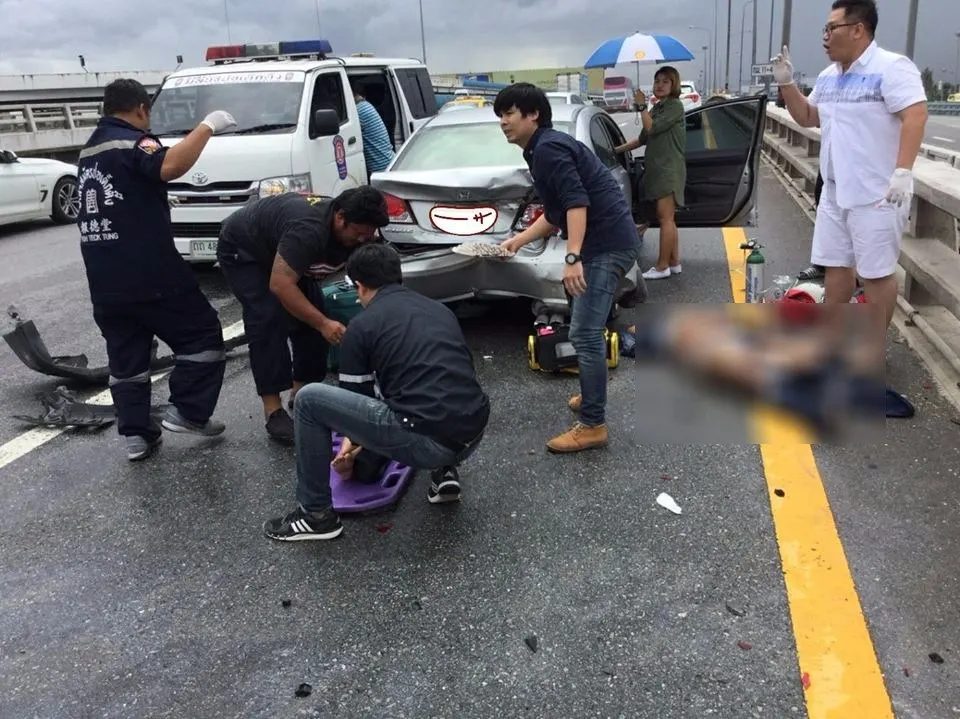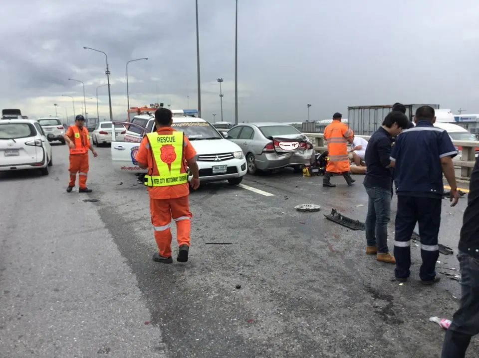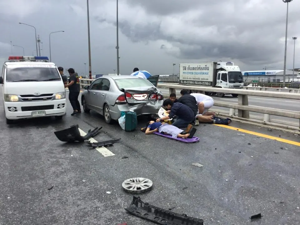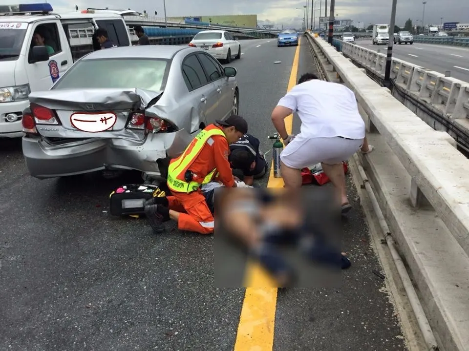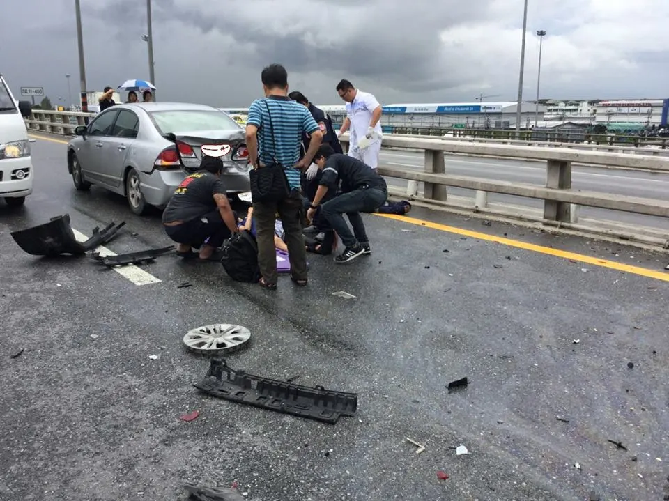 อุทาหรณ์ รถจอดเสียข้างทาง วินาทีชนเต็มๆ! คนยืนราวสะพานโดนอัดก็อบปี้! บาดเจ็บ 5 ราย ตาย1