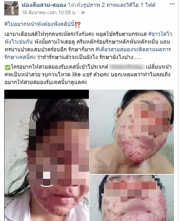 เอามาเตือนสติให้ทุกคนระมัดระวังกันค่ะ หยุดใช้ครีมตามกระแส #ขาวใสไวพังไวเช่นกัน พังมั้ยถามใจเธอดู ครีมหลักร้อยรักษาหลักพันหลักหมื่น แถมทรมานปวดแสบปวดร้อนอีก รักษาก็ยาก #เดี๋ยวสวยสยองจะติดตามผลการรักษาเคสนี้ค่ะ ว่าถ้ารักษาแล้วจะเป็นยังไง รักษายังไงบ้าง.....