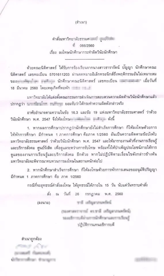 คำสั่งลงโทษทางวินัยของนักศึกษากรณีล่วงละเมิดทางเพศ
