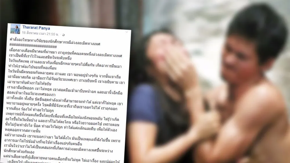 เฟซบุ๊กที่ชื่อ Thararat Panya เปิดเผยเรื่องราวของตัวเองที่ถูกรุ่น พี่มหาวิทยาลัpเดียวกัน ล่วงละเมิดทางเพศเมื่อเดือนมีนาคมที่ผ่านมา และเลือกที่จะไม่เงียบ ไม่ยอมเป็นหยื่อเพราะนั่นคือสิทธิที่ต้องปกป้องตัวเอง โดยออกมาโพสท์เฟซบุ๊กส่วนตัวเพื่อเปิดเผยเรื่องราวนี้เพื่อเป็นอุทาหรณ์กับคนอื่นๆ ข้อความระบุว่า...