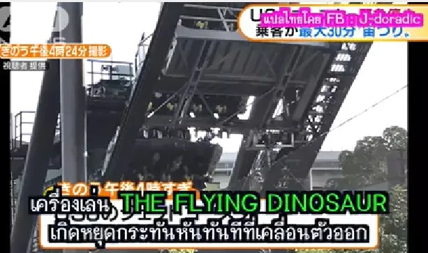 เฟซบุ๊กJ-doradic ดิคออนไลน์ไทย-ญี่ปุ่น ได้รายงานคลิปข่าวแปลเป็นไทยระบุว่า เมื่อวันที่ 20 ส.ค. 60 เครื่อง เล่น The flying Dinosaur ที่ US๋J ( Universal Studio Japan) ในโอซาก้า ประเทศญี่ปุ่น หยุดเล่นกระทันหัน ทำให้คนที่เล่นอยู่ 30 คน ห้อยหัวลงมาด้านล่าง นานประมาณ 30นาที ก่อนจะถูกช่วยเหลือออกมาที่ละคร และไม่มีผู้ใดได้รับบาดเจ็บ