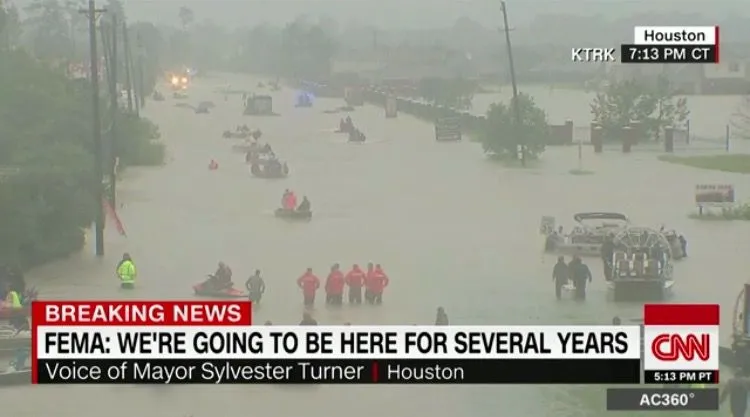 จากเหตุการร์เฮอริเคนฮาร์วีย์ที่มีความรุนแรงระดับ 4 ที่เข้าถล่มเมืองฮุสตันเมื่อค่ำวันศุกร์โดยฝนตกหนักทำให้ปริมาณน้ำฝนสะสมถึง 30 นิ้ว และถนนทุกสายกลายเป็นแม่น้ำ น้ำท่วมส่งผลให้สนามบินหลัก 2 แห่งของเมืองต้องปิดให้บริการเครื่องบินพาณิชย์ทุกเที่ยวบิน และโรงพยาบาล 2 แห่งอพยพผู้ป่วย สถานีโทรทัศน์ท้องถิ่นแห่งหนึ่งไม่สามารถออกอากาศได้ และบ้านเรือนประชาชนหลายพันหลังไฟฟ้าดับ