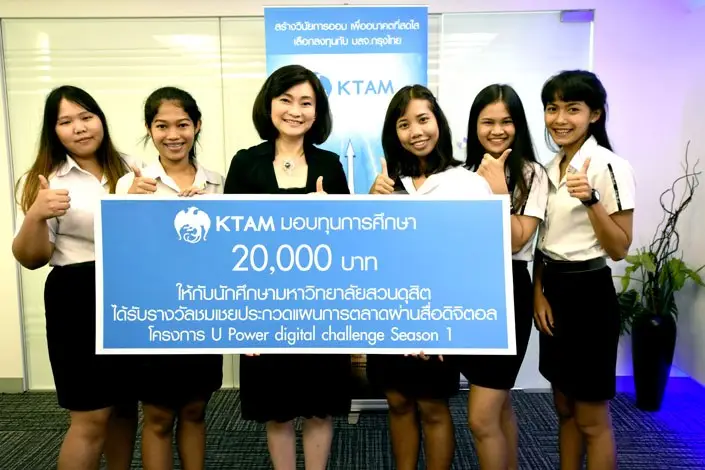 นางชวินดา หาญรัตนกูล กรรมการผู้จัดการ บริษัทหลักทรัพย์จัดการกองทุน กรุงไทย จำกัด (มหาชน) หรือ KTAM มอบทุนการศึกษาแก่นักศึกษามหาวิทยาลัยสวนดุสิต และมหาวิทยาลัยอัสสัมชัญ จำนวน 2 ทุนๆ ละ 20,000 บาท เนื่องในโอกาส ติด 1ใน 5 ทีมสุดท้ายที่คว้ารางวัลการจัดทำแผนการตลาดผ่านสื่อดิจิตอลในโครงการ U Power Digital Idea Challenge Season 1 ซึ่งให้นักศึกษาจากมหาวิทยาลัยทั่วประเทศ ประกวดแผนการตลาดซึ่ง KTAM เป็นหนึ่งในผู้สนับสนุนโครงการ โดย KTAM กำหนดหัวข้อการแข่งขันเรื่อง “ปลูกฝังเยาวชนรักการออมผ่านกองทุนรวม” และโครงการได้รับการสนับสนุนจากกระทรวงดิจิทัลเพื่อเศรษฐกิจและสังคม และสมาคมอุตสาหกรรมเทคโนโลยีสารสนเทศไทยโดยมีนักศึกษาส่งผลงานเข้าประกวดกว่า 357 ผลงาน จาก 138 สถาบันทั่วประเทศ