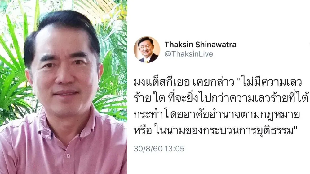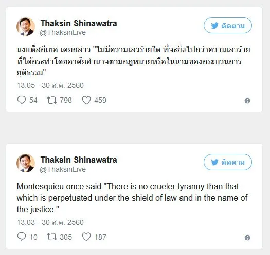 วันที่ 30 ส.ค. นพ.วรงค์ เดชกิจวิกรม อดีตส.ส.พรรคประชาธิปัตย์ โพสต์เฟซบุ๊ค กรณีนายทักษิณ ชินวัตร อดีตนายกรัฐมนตรี โพสต์ทวิตเตอร์ โดยอ้างคำพูดมงแต็สกีเยอข้อความ "เลวร้ายที่สุด คือความเลวร้ายที่กระทำในนามกระบวนการยุติธรรม" ว่า "มาเร็วกว่าที่คาด นายทักษิณได้ทวีตข้อความ ดังที่มองเตสกิเออ ได้กล่าวว่า "ไม่มีเผด็จการที่ไหนจะป่าเถื่อนไปกว่าเผด็จการที่รับความคุ้มครองของกฎหมายและกระทำการต่างๆ ในนามกฎหมาย" เขามาในลูกไม้เดิมทุกอย่าง ในช่วงที่นายสมชายได้ประโยชน์จากการตัดสินของศาล นายสมชายก็ขอบคุณศาลที่เป็นที่พึ่งได้ พอช่วงนางสาวยิ่งลักษณ์และนายบุญทรง ต้องถูกดำเนินคดี (แม้ยิ่งลักษณ์ยังหนี) เพราะไม่สามารถใช้ถุงขนม หรือส่งคนไปต่อรองได้เหมือนก่อน ก็พยายามโยงไปเรื่องเผด็จการกระทำการต่างๆในนามกฏหมาย