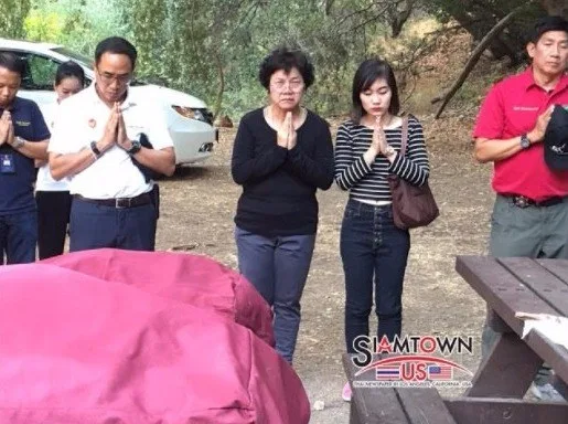 ขณะที่ ครอบครัวของนักศึกษาทั้งสองคน ร่วมกันประกอบพิธีทางศาสนา พร้อมด้วยกงสุลใหญ่ นายธานี แสงรัตน์ และนายคิด ฉัตรประภาชัย ทำพิธีโดยพระครูใบฎีกาบุญทัน ฉปณโณ วัดพรหมจริยการาม เมืองเฟรซโน่ แคลิฟอร์เนีย.