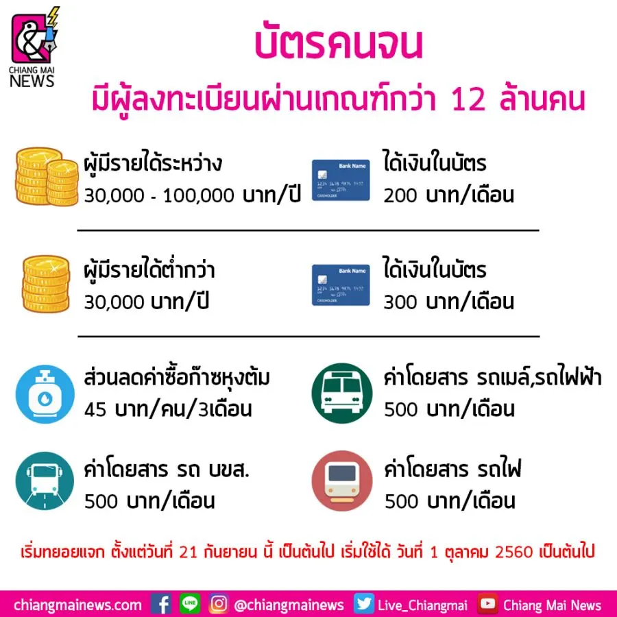 โดยตั้งแต่วันที่ 1 ตุลาคม 2560 นี้ ผู้ที่ลงทะเบียนคนจนทั่วประเทศจะสามารถใช้บัตรคนจนได้ จากการลงทะเบียนประชาชนมาลงทะบียนคนจนจำนวนมาก มีคนถูกตัดสิทธิ์ 2.53 ล้านคน แต่ในจำนวน 11.67 ล้านคน ทั้งหมดคุณสมบัติตรงตามภาครัฐกำหนด และวงเงินที่รัฐบาลช่วยเหลือผ่านบัตร สามารถนำไปซื้อสินค้าที่ขายในร้านที่ขึ้นทะเบียนกับกระทรวงพาณิชย์ได้ทุกชนิด ไม่เว้นแม้กระทั่ง เหล้า บุหรี่ แต่จะรณรงค์จอความร่วมมือไม่ให้ขายแทน