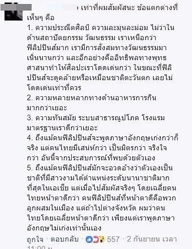 นอกจากนี้ยังยอมรับอีกว่าไท ยมีความได้เปรียบในหลายๆด้า น ซึ่งแน่นอนว่าฟิลิปปินส์ควร เอาเป็นแบบอย่างเพื่อเร่งพั ฒนาให้ทันไทยต่อไปในอนาคต