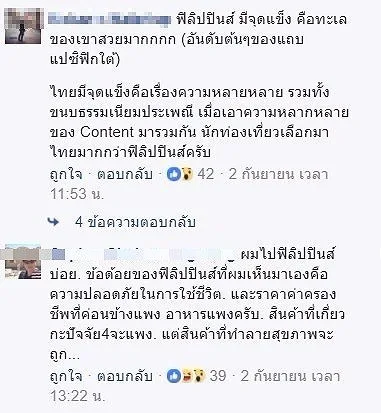 ABS-CBN News สื่อชั้นนำของประเทศฟิลิปปิ นส์ตั้งคำถามว่าทำไมประเทศไ ทยถึงมีจำนวนนักท่องเที่ยวต ่างชาติมากถึง 32 ล้านคน ในขณะที่ฟิลิปปินส์มีจำนวนน ักท่องเที่ยวเพียง 5 ล้านคนเท่านั้น ทั้งๆที่สองประเทศก็มีแหล่ง ท่องเที่ยวและวัฒนธรรมที่โด ดเด่นไม่แพ้กัน