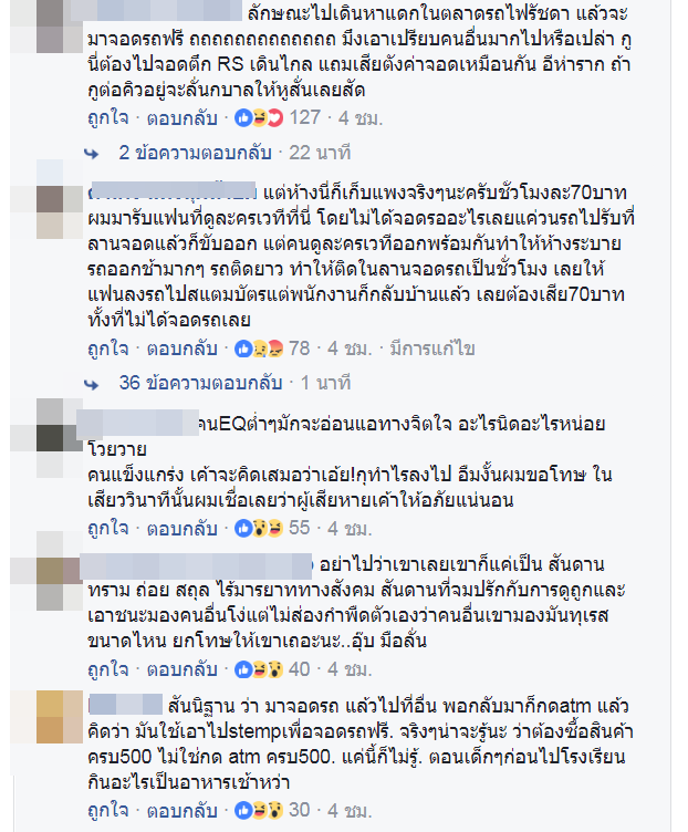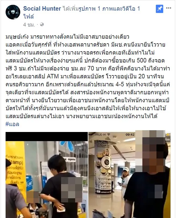 แอดคะเมื่อวันศุกร์ที่ ที่ห้างเอสพลานาดรัชดา มีผช.คนนึงมายืนโววายใส่พนักงานแสตมป์บัตร ว่านางมาจอดรถเพื่อกดเอทีเอ็มทำไมไม่แสตมป์บัตรให้นางเรื่องง่ายๆแค่นี้ ปกติต้องมาซื้อขอเกิน 500 ถึงจอดฟรี 3 ชม.ถ้าไม่มีจะต้องจ่าย ชม.ละ 70 บาท คือที่พีคคือนางไม่ได้มาทำอะไรเลยเอาสลิป ATM มาเพื่อแสตมป์บัตร โววายอยู่เป็น 20 นาทีจนคนรอคิวยาวมาก อีกเพราะด้วยดึกแล้วประมาณ 4-5 ทุ่มห้างจะมีจุดนี้แค่จุดเดียวที่จะแสตมป์บัตรได้ สงสารน้องพนักงานพูดจาดีมากบอกหนูทำตามหน้าที่ นางยืนโวยวายเพื่อเอาชนะพนักงานโดยให้พนักงานแสตมป์บัตรให้ได้ทั้งๆที่มันนานแล้วมีลุงคนนึงเอาสลิปให้เพื่อให้นางเอาไปใช้แสตมป์บัตรแต่นางไม่เอา นางพยายามเอาชนะน้องพนักงานให้ได้