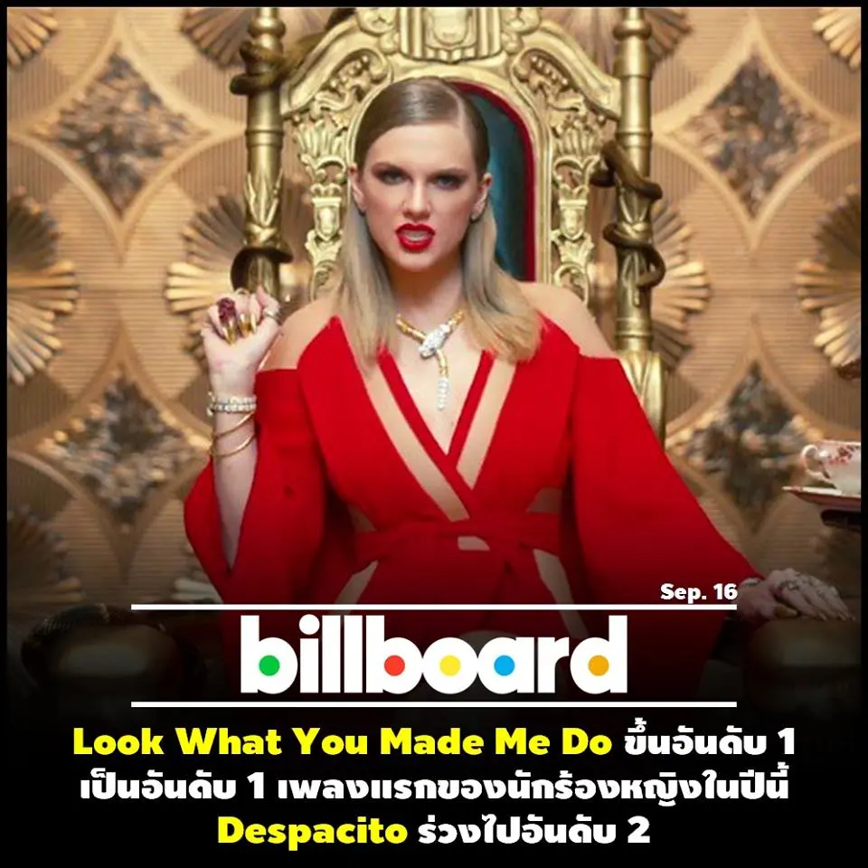 - Look What You Made Me Do เป็นเพลงของนักร้องหญิงเพลงแรกที่ขึ้นอันดับ 1 ใน Hot100 ในปี 2560 (ทั้งปีนี้อันดับ 1 เป็นของผู้ชายหมดเลย)