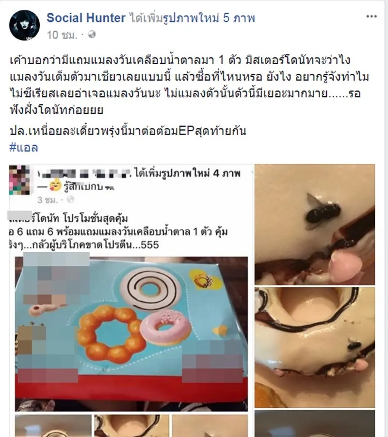 Social Hunter ได้เพิ่มรูปภาพใหม่ 5 ภาพ เรื่องราวของลูกเพจคนหนึ่ง ที่ซื้อโดนัทยี่ห้อดังมากิน แต่แล้วเจอสิ่งแปลกปลอมปนมาบน โดนัทขิ้นหนึ่ง มันคืออะไร มีคอมเม้นกันไปต่างๆ นานา