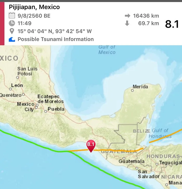 เมื่อสักครู่นี้ หรือ เวลา 1.20 นาฬิกาของวันที่ 7 ก.ย. ตามเวลาท้องถิ่นประเทศเม็กซิโก กรมสำรวจธรณีวิทยาแห่งสหรัฐอเมริกา (United States Geological Survey) รายงานว่าเกิดเหตุแผ่นดินไหวขนาด 8.1 แมกนิจูดในมหาสมุทรแปซิฟิกนอกชายฝั่งเม็กซิโก แรงสะเทือนส่งผลให้อาคารในกรุงเม็กซิโกซิตี้สั่นไหว