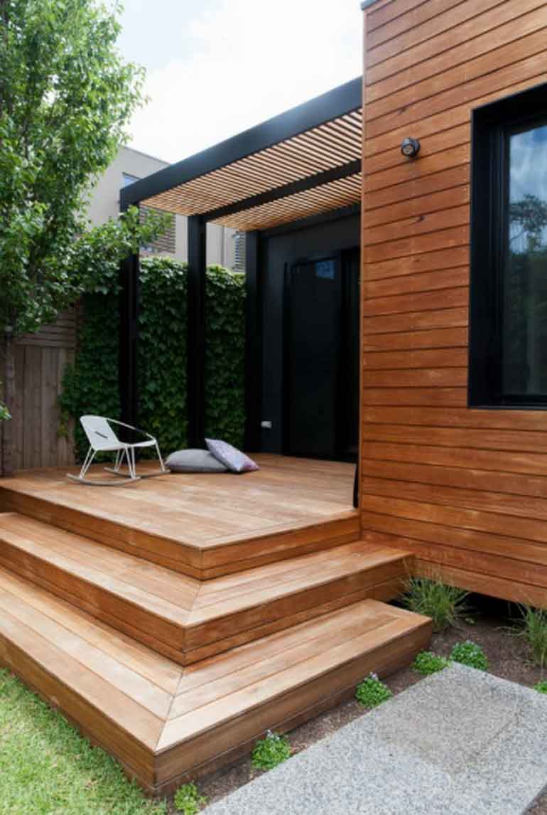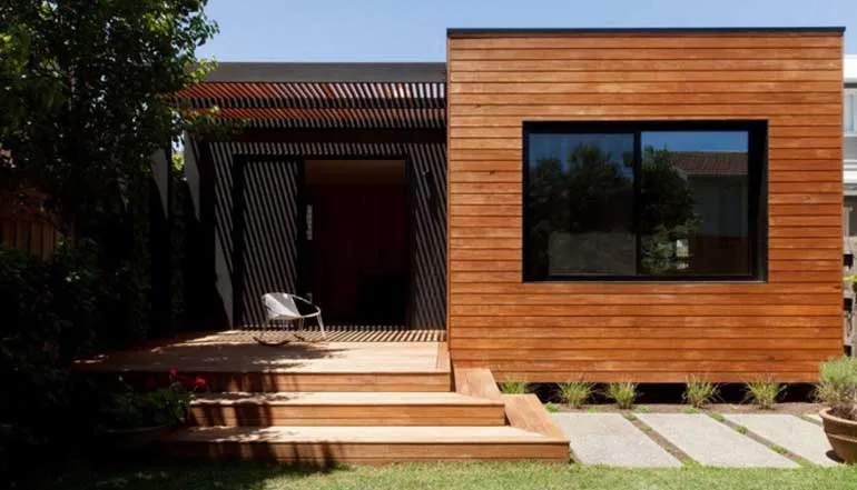 นี่คือแบบบ้านไม้สมัยใหม่ที่มาในไสตล์โมเดิร์น เรียบง่ายด้วยการออกแบบตัวบ้านให้มีทรงสี่เหลี่ยมธรรมดา ขนาด 1 ชั้น ภายนอกตกแต่งด้วยไม้ฝาเรียบๆ ดูเป็นเอกลักษณ์เฉพาะตัว พร้อมด้วยหลังคาระแนงไม้เพิ่มความโดเด่นเล็กๆ และให้มีแสงธรรมชาติ ประกอบกับชานบ้านเล็กๆ ไว้พักผ่อนยามเย็นหรือเช้าๆ นั่งจิบกาแฟกัน