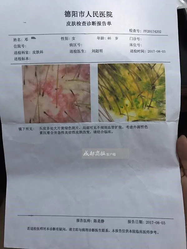หญิงจากมณฑลเสฉวนประสบเหตุสุดช้ำ ไปร้านเสริมสวยแห่งหนึ่งเพื่อหวังย้อมผมให้เป็นสีเขียวเหลือบเทา โดยช่างใช้เวลาทั้งหมด 7 ชั่วโมง และทีการย้อมกัดสีผมถึง 4 ครั้ง จนหนังศีรษะของเธอถูกทำลายเสียหาย ต้องโกนผมทิ้งหมดทั้งศีรษะ ทางช่างได้แจ้งเธอว่า ตอนย้อมครั้งแรกสีผมไม่ติด พอย้อมครั้งที่ 2 เริ่มมีอาการปวดแสบ แต่ช่างบอกว่าเป็นเรื่องปกติเธอจึงปล่อยให้ทำต่อไป ก่อนจะย้อมครั้งที่ 3 อาการแสบหนังศรีษะเริ่มหนักขึ้น เธอเลยแย้งว่ามีบางอย่างผิดปกติกับยาย้อมผม แต่ช่างก็ยังคงบอกว่าเป็นเรื่องปกติ และยังคงย้อมสีต่อไป