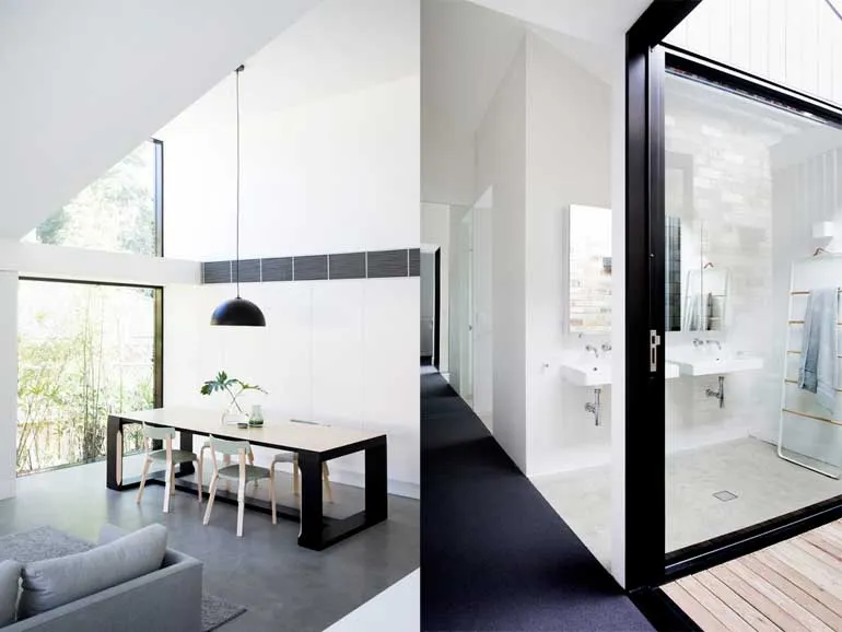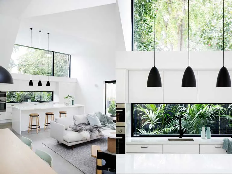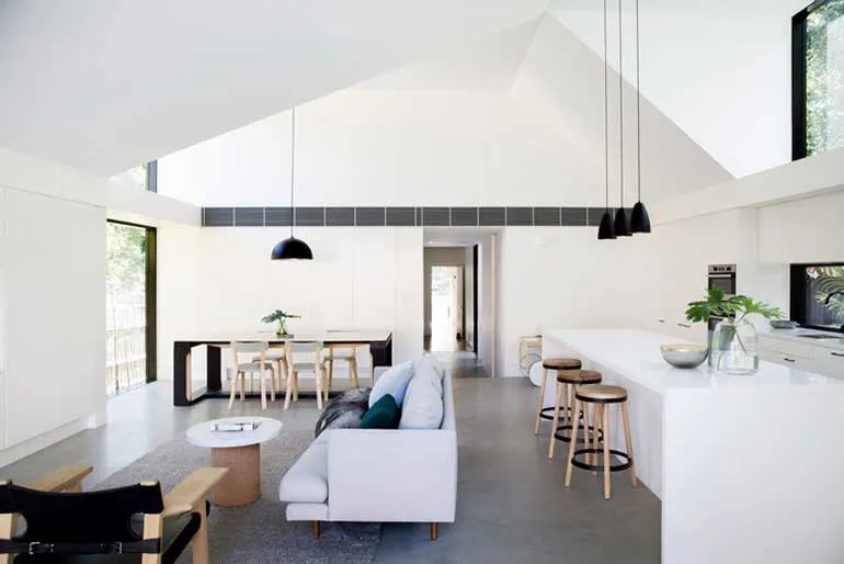 นี่คือแบบบ้านสุดโมเดิร์นจากประเทศออสเตรเลีย ที่ภายนอกมาในโทนสีขาว หละงคาทรงจั่ว ยาวจรดพื้น เป็นบ้านชั้นเดียว ใช้ผนังสีขาวเรียบตัดกับสีดำตามแนวขอบต่างๆ ทำให้ดูมีความโดดเด่น ไม่เหมือนใครเอามากๆ ภายในก็จัดว่าโดนใจสุดๆ ด้วยการเน้นให้มีพื้นที่โล่ง เน้นความกว้าง ใช้โทนสีขาวและแซมด้วยสีดำของเฟอร์นิเจอร์ ทำให้ภายในบ้านนั้นน่าอยู่สุดๆ สะอาดตา แถมยังใช้เพดานทรงจั่วที่สูงโปร่ง บวกกับการใช้กระจก ทำห้ภายในบ้านดูกว้างใหญ่โล่งสบายสุดๆ