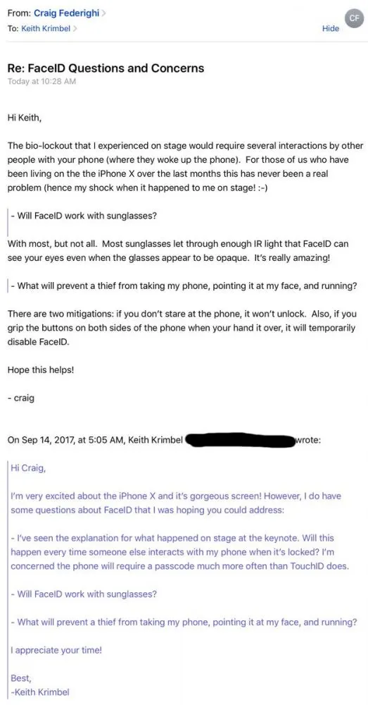 E-mailed #CraigFederighi about #FaceID and actually got a response!