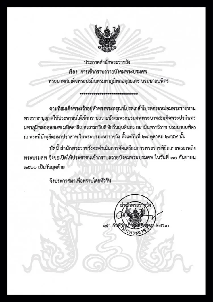 บัดนี้ สำนักพระราชวังจะดำเนินการจัดเตรียมการพระราชพิธีถวายพระเพลิงพระบรมศพ จึงขอเปิดให้ประชาชนเข้ากราบถวายบังคมพระบรมศพ ในวันที่ 30 ก.ย.2560 เป็นวันสุดท้าย