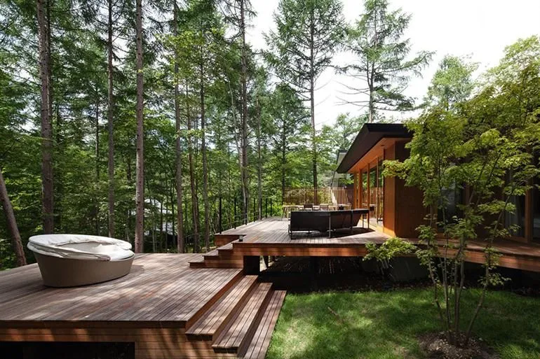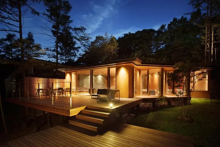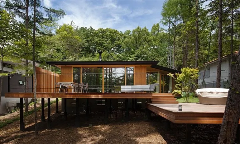 บ้านหลังนี้เป็นงานไม้ที่มาในแบบบ้านชั้นเดียว ยกพื้นต่ำ หลังคาทรงเพิงหมาแหงน ตกแต่งผนังด้วยงานกระจกเพื่อรับแสงจากธรรมชาติ พร้อมทั้งออกแบบให้มีลานบ้านที่กว้างขวางเป็นงานไม้เช่นกันยื่นออกมาอีกส่วน ไว้สำหรับจัดกิจกรรมในครอบครัวซึ่งถือว่าโดดเด่นสุดๆ ไปเลยครับ