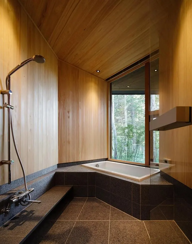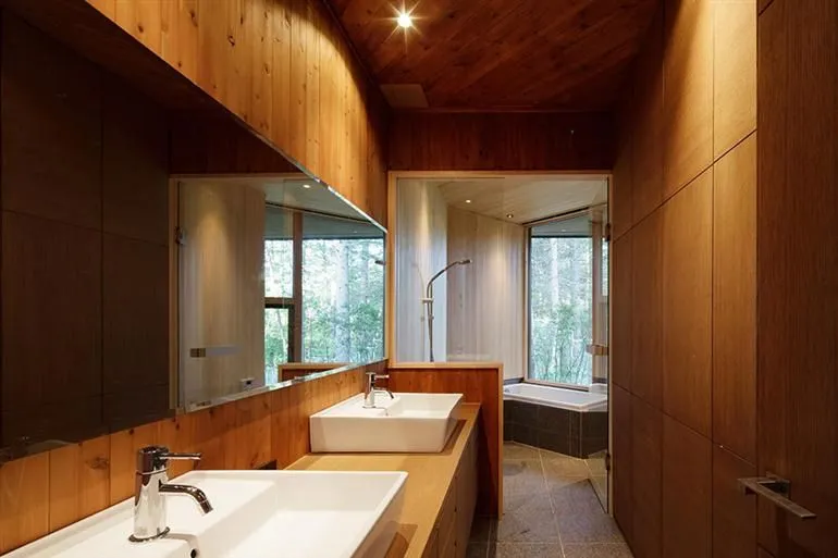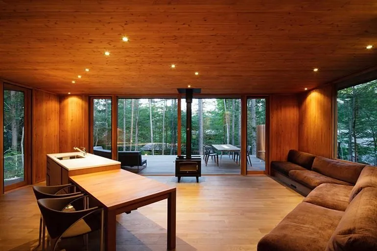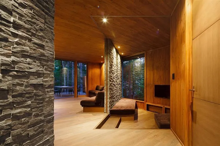 นอกจากตัวยบ้านด้านนอกจะดูโมเดิร์นน่าอยู่มากๆ แล้ว ภายในนั้นยังถูกตกแต่งได้อย่างหรูหราน่าอยู่สุดๆ ด้วยการเน้นโชว์พื้นผิวของไม้ ผนังใช้หินสีเทา เพดานไม้ ผนังไม้ พื้นไม้ ดูอบอุ่นสุดๆ และยังใช้เฟอร์นิเจอร์น้อยชิ้นทำให้ตัวบ้านดูโล่งกว้างน่ายู่เอามากๆ