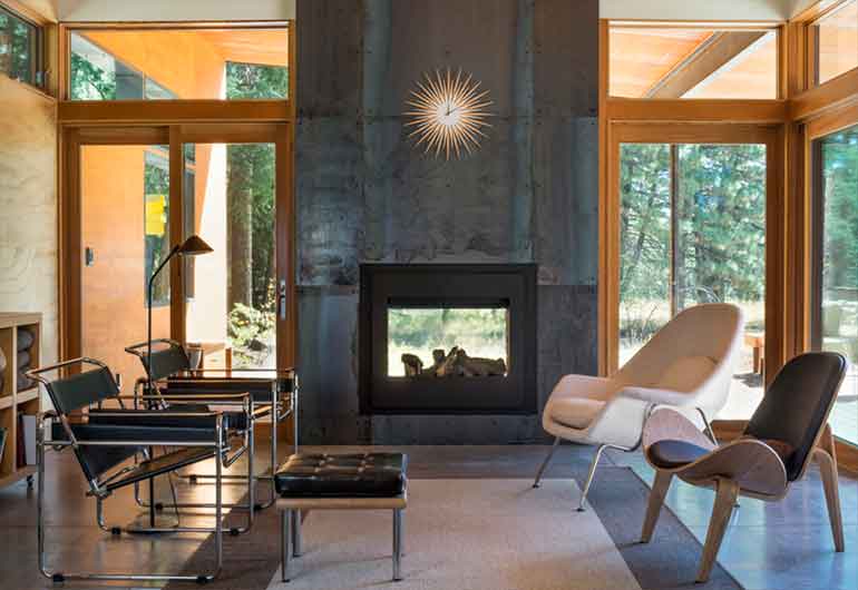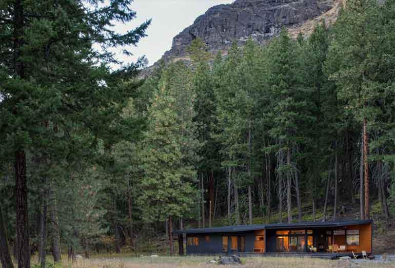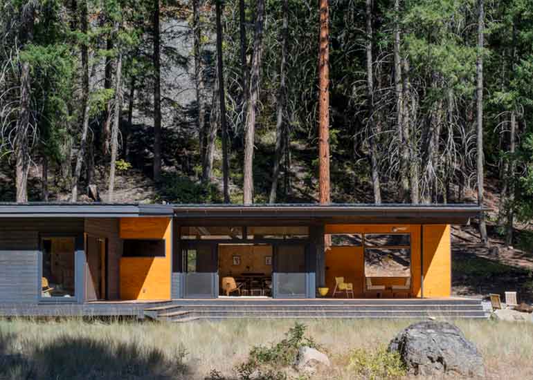 นี่คือแบบบ้านโมเดิร์นหลังเล็กท่ามกลางธรรมชาติ ตัวบ้านใช้โครงสร้างหลักเป็นเหล็กบวกกับงานไม้อันโดดเด่น ด้วยสีภายนอกโทนเข้ม ตัดกับสีเนื้อไม้ทำให้ดูเข้ากันเอามากๆ ดีไซน์ตัวบ้านนั้นเป็นรูปตัว L หลังคาทรงเพิงหมาแหงน หน้าบ้านออกแบบให้มีเฉลียงเล็กไว้รับแขกก่อนเข้าบ้านด้วย และใช้กระจกผสมผสานในหลายๆ ส่วนของตัวบ้านทำให้ได้รับแสงธรรมชาติอย่างเต็มที่ดูไม่อึดอัดตครับ