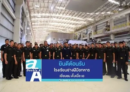 ดั๊บเบิ้ล เอ กระดาษจากคันนา เปิดบ้านต้อนรับคณะนักเรียนช่างฝีมือทหาร ชั้นปีที่ 3 โรงเรียนช่างฝีมือทหาร สถาบันวิชาการป้องกันประเทศ นำโดยพันเอก รวินทร์ เจริญชัย ผู้บังคับการกรมนักเรียน โรงเรียนช่างฝีมือทหาร เข้าเยี่ยมชมกระบวนการผลิตเยื่อและกระดาษที่เป็นมิตรกับสิ่งแวดล้อม เรียนรู้โมเดล “กระดาษจากคันนา” ที่มีส่วนช่วยสร้างรายได้เสริมให้กับเกษตรกรที่ปลูกต้นกระดาษบนคันนาที่ว่างเปล่าและช่วยลดโลกร้อน พร้อมทั้งเข้าใจระบบการจัดการใช้ทรัพยากรอย่างรู้คุณค่าในแนวคิด “ทำของเสีย ไม่ให้เสียของ” ที่นำของเหลือใช้จากการผลิตเยื่อและกระดาษ อาทิ เปลือกไม้ เศษไม้ น้ำมันยางไม้ มาเป็นเชื้อเพลิงชีวมวลผลิตกระแสไฟฟ้า ผ่านการนำเสนอด้วยภาพยนตร์ระบบ 4 มิติ ณ โรงงานดั๊บเบิ้ล เอ จ.ปราจีนบุรี