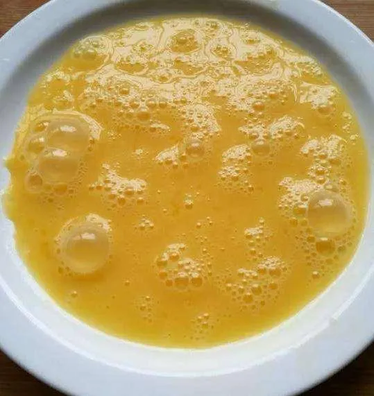 2. ตอกไข่ใส่จาน หรือถ้วยแล้วแต่สะดวก ตีจนไข่แดงและไข่ขาวเข้ากัน
